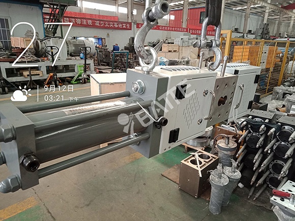 擠出機換網(wǎng)器為雙工作位替換工作,一慮網(wǎng)過濾,一慮網(wǎng)在換網(wǎng)器主體外備用。往復(fù)板板兩端有網(wǎng)塊保溫加熱裝置,用于過濾易結(jié)晶或易老化的塑料時,在更換濾網(wǎng)時應(yīng)取出網(wǎng)塊,清除出網(wǎng)孔中的塑料。單板式換網(wǎng)器在更換慮網(wǎng)時有蓄能器增加動力,因此更換濾網(wǎng)網(wǎng)的速度快、動力大,在更換慮網(wǎng)時嚴(yán)禁網(wǎng)塊或濾網(wǎng)毛邊漏出往復(fù)板外面,更不允許用手觸摸。